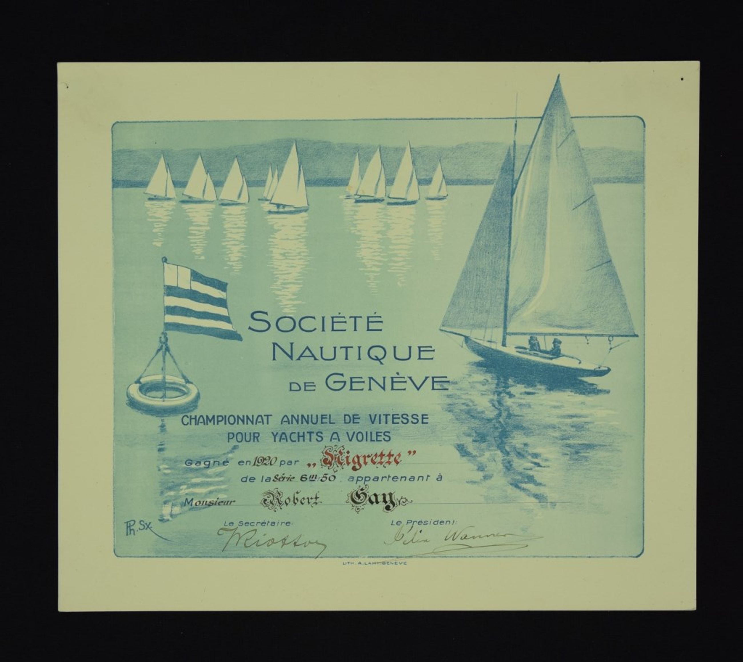 Diplôme remis par la Société Nautique de Genève à Robert Gay pour sa victoire lors du Championnat annuel de vitesse pour yachts à voiles (série 6m50).