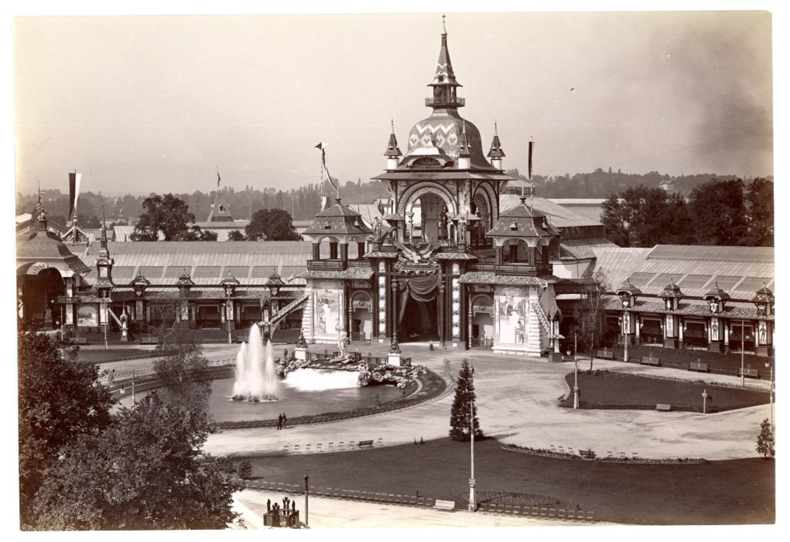 Photographie figurant le « Pavillon des Beaux-Arts » de l'Exposition Nationale Suisse de 1896 à Genève. On y devine quelques-unes des fresques réalisées par le peintre Ferdinand Hodler.